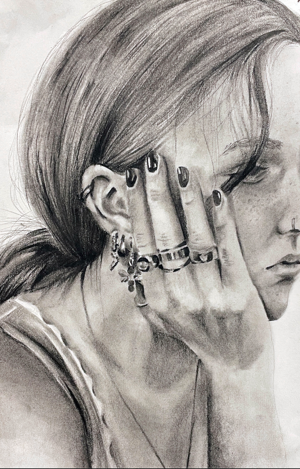 Caitlin’s work is very much rooted in realism, with a focus on human features. Her pieces often express things she enjoys, such as music, clothing and accessories. Oil paint, water colors, charcoal, and pastels are all mediums Caitlin uses, making her mesmerizing work almost unpredictable.